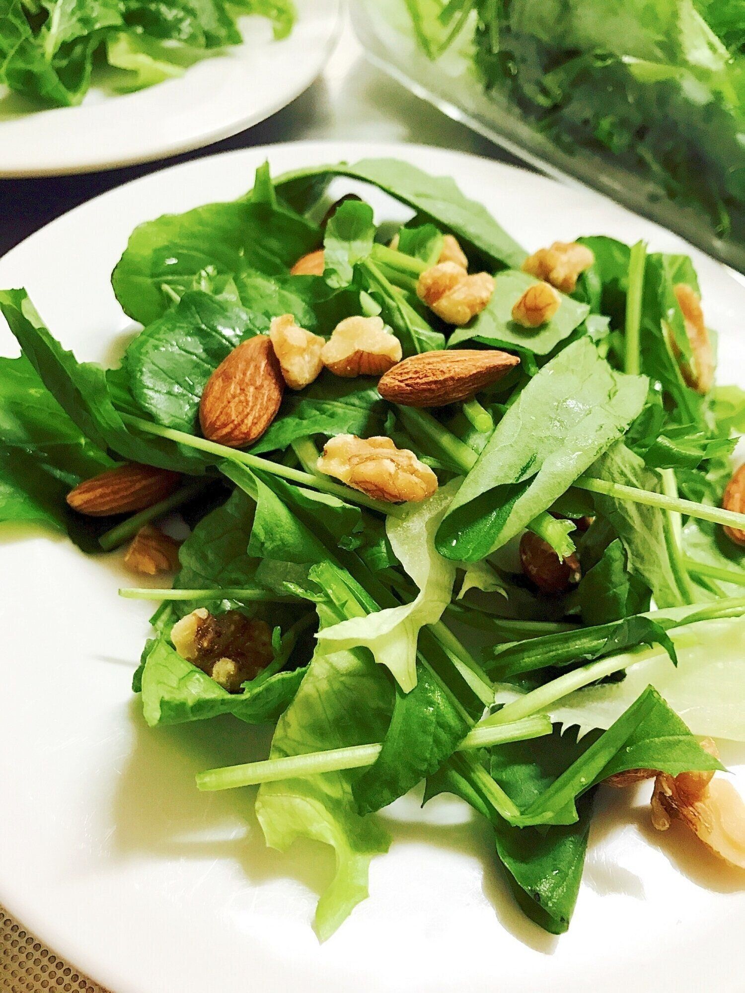ハーブ野菜の定番料理といえば、素材の味や香りをそのまま楽しめるサラダ!ルッコラと調味料を合わせるだけなので、5分以内で簡単につくれちゃいます。歯応えのあるアーモンドとくるみが食感のアクセントになって、食べるのが楽しいですよ。