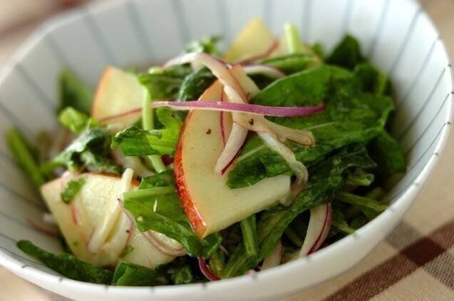 こちらは、リンゴの甘みと紫玉ねぎの辛み、ルッコラの苦みがバランスよく合わさったサラダです。風味の強い食材と、レモンとマスタードの酸味をきかせたドレッシングがベストマッチ。彩りが鮮やかなのもいいですね。