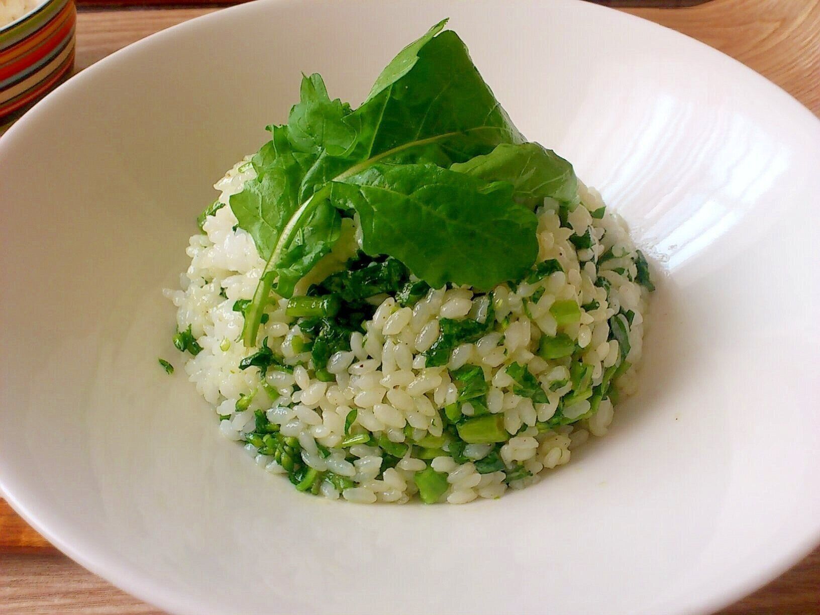 ご飯に刻んだルッコラを混ぜ込んだこちらのレシピは、見た目のインパクトもバッチリ。ルッコラを茎から葉先までムダなく使うことで、辛みと苦みを存分に味わえる一品です。