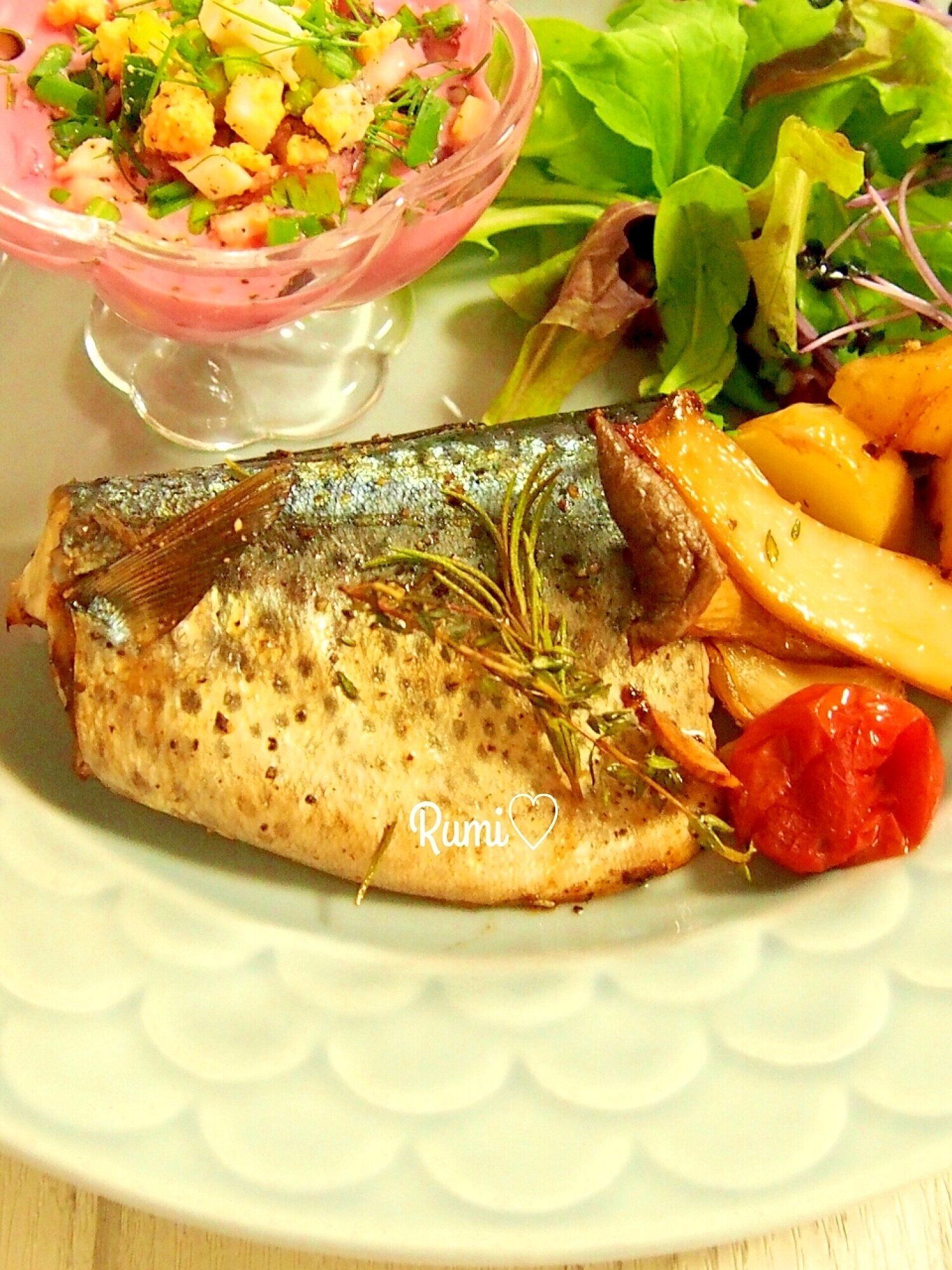 お魚の洋食メインメニューにおすすめの、サバの香りオーブン焼き。サバに下味をつけてふっくらと焼き上げます。半月切りのレモンをのせて華やかに!おしゃれなプレートに盛りつけておもてなしするのも素敵です。