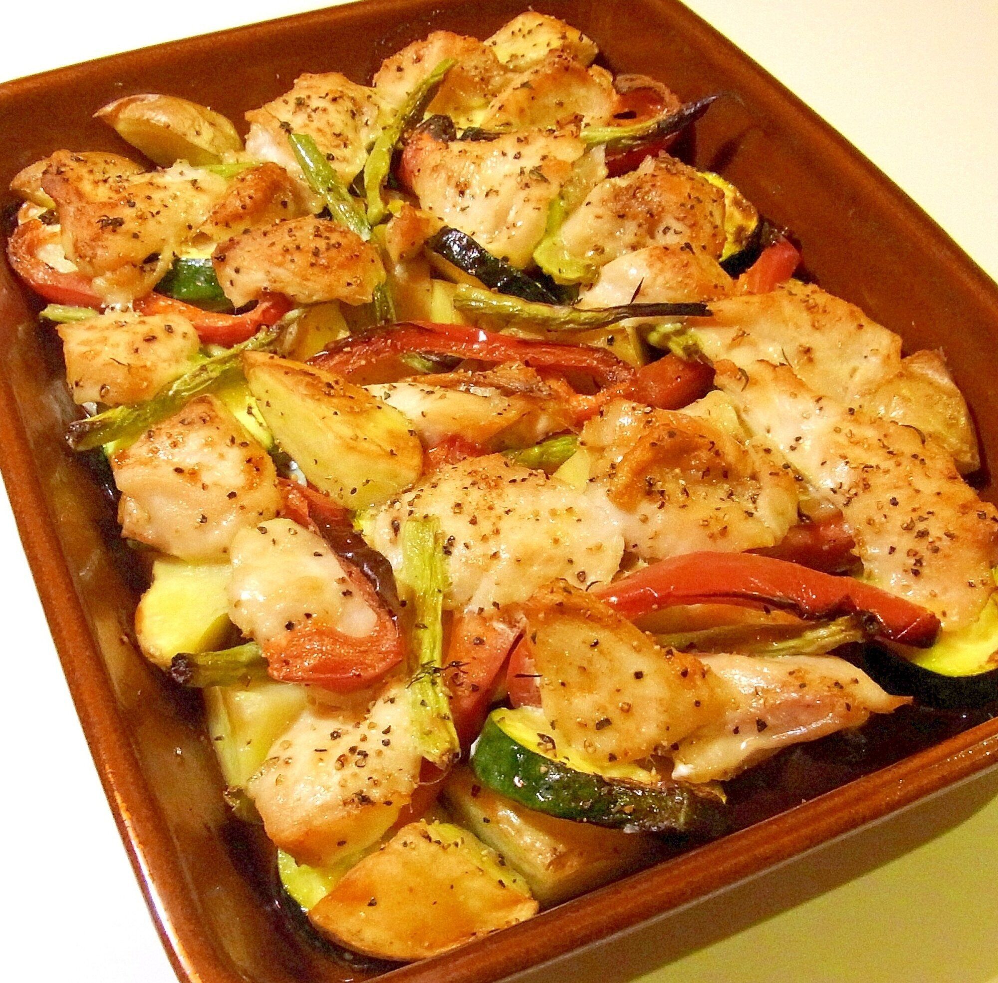 色鮮やかな野菜とオーブンで焼いた鶏肉の一品料理です。最初に鶏肉をフライパンで焼きつけ、その後にオーブンでゆっくり火を通すとふっくらと仕上がります!白ご飯との相性がバツグンなおかずのレシピです。