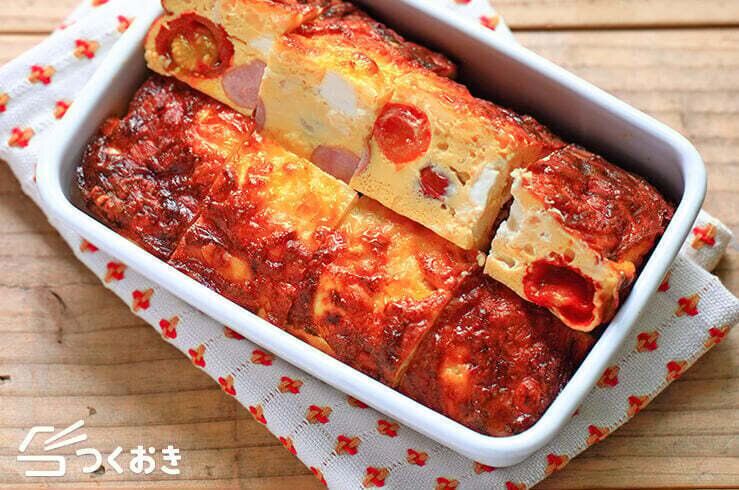 ミニトマトや玉ねぎ、ソーセージに、クリームチーズも入ったオムレツのレシピです。切らずにしき詰めたミニトマトが見た目にもアクセントに。形よく切り分けるため、カットは冷めてからがよいそうです。