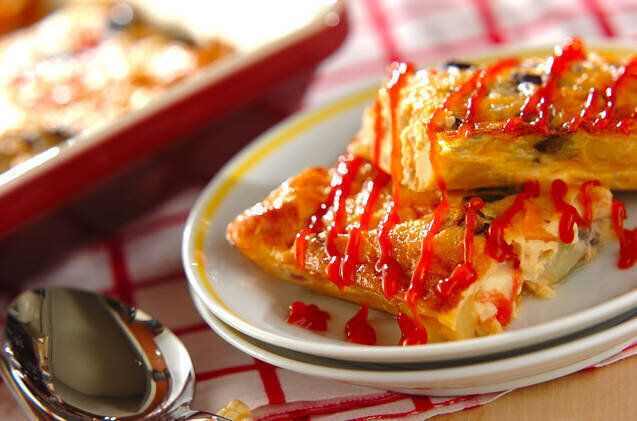 食材を耐熱皿に入れてオーブンで焼くオープンオムレツのレシピです。耐熱皿にクッキングシートを敷くことで、取り出しやすくなり手洗いが簡単に!朝食やお弁当のおかずとして活躍すること間違いなしです。