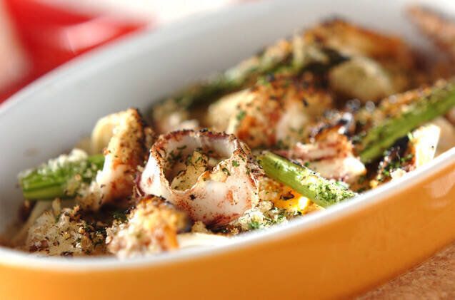イカのうま味と、たっぷりの野菜のおいしさを楽しめそうな、オーブン焼きのレシピ。洋食のメインにおすすめです。彩りもよく、パーティーメニューにもぴったり。お酒との相性もよさそうですね!