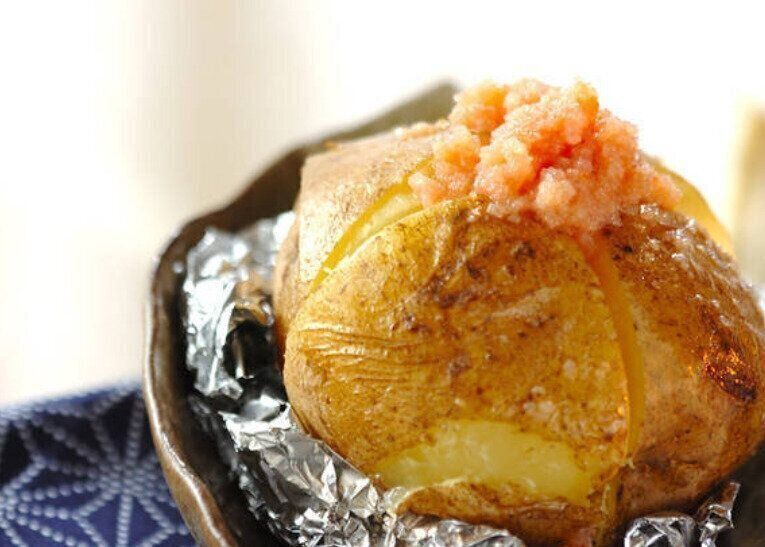 レンジとオーブンでホクホク&香ばしく焼いたじゃがいもに、明太子バターをのせていただくうま味たっぷりの一品。おやつにもおかずにもなるボリューム感で、明太子とマヨネーズを合わせて明太マヨにするのもおすすめです。