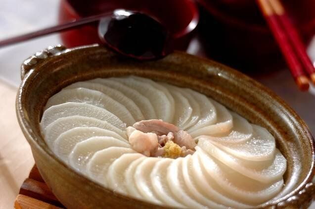 具材は大根と豚バラ肉のみという、見た目もつくり方もシンプルなレシピ。薄く輪切りにした大根を、花びらのようにずらして並べるのがポイントです。仕上げに、ゴマ油と黒こしょうを加えて食べても◎。