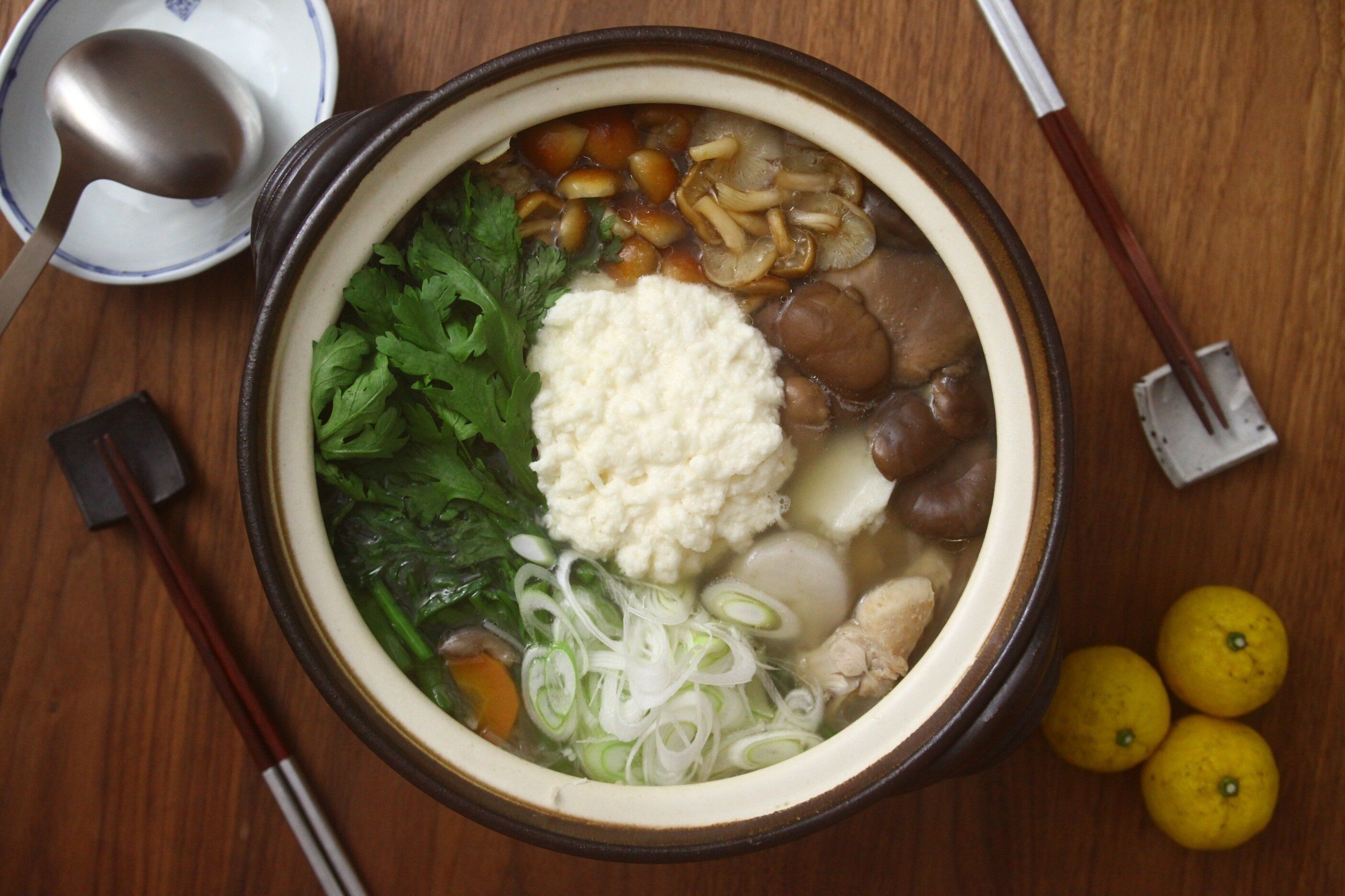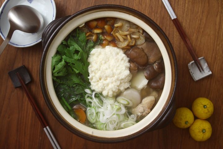 きのこ類とすりおろした大和芋を合わせたこちらのお鍋は、鶏肉ときのこのだしがたっぷりとけこんだ絶品です。締めはご飯を入れて、雑炊にするのがおすすめ!うま味を最後まで堪能してくださいね。