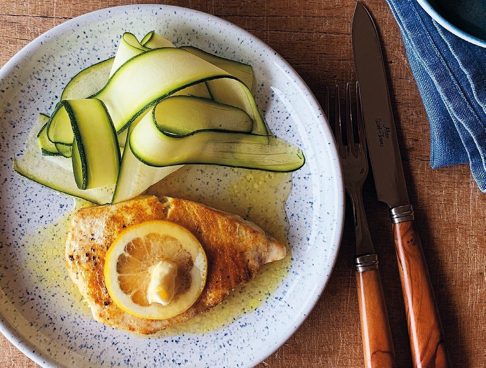 (1)にふんわりとラップを掛け、2cmほどのすき間を1カ所空けて電子レンジで6分ほど加熱する。器に盛り、残りのバターをのせて煮汁をかけ、ズッキーニを添える。