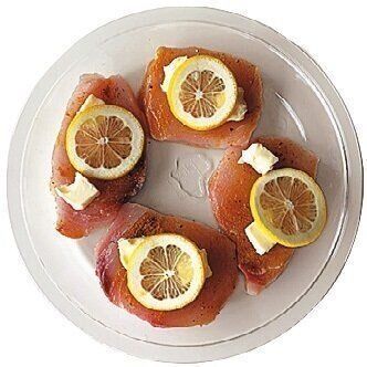 直径23cmほどの耐熱皿にめかじきを並べ、[A]を両面にふる。バターの半量を小さくちぎってめかじきにのせ、レモンものせて白ワインをふる。