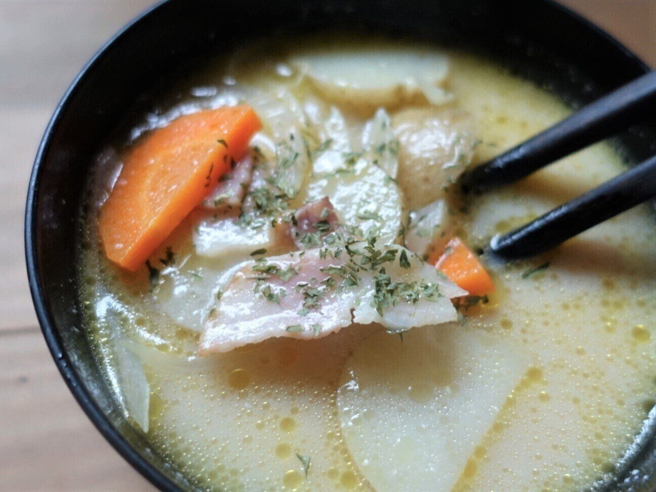 筆者が聞いた牛乳みそ汁の具材は、ベーコン、ジャガイモ、人参、タマネギです。まずは鍋にオリーブオイルを入れて、具材を炒めます。それから、水を入れて、具材を茹でます。