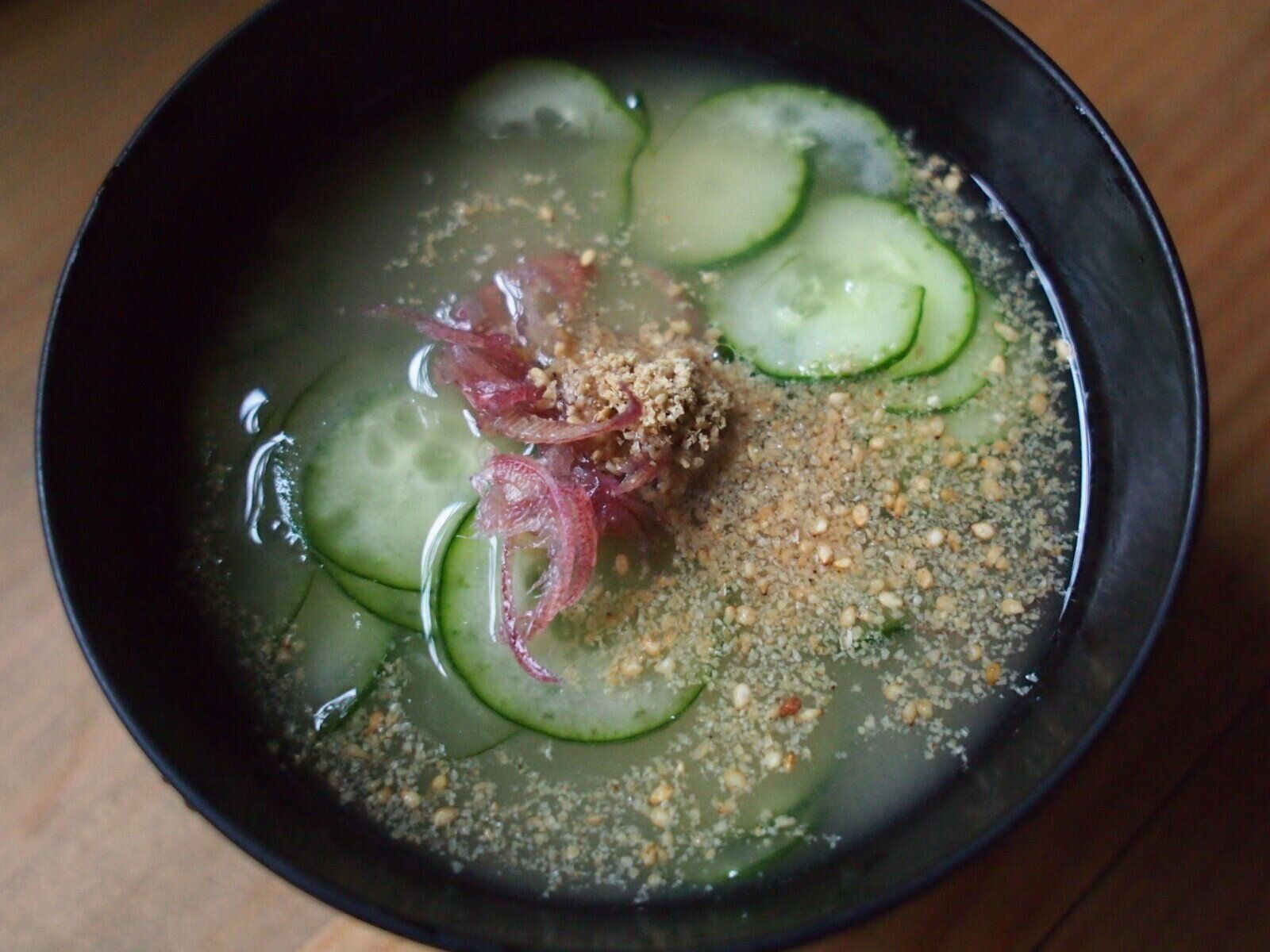 あまったみそ汁がなければ水に味噌を溶いて顆粒だしを入れてもいいでしょう。夏にさっぱりいただけます。これはインスタントのみそ汁でも簡単にできます。少な目のお湯を入れて、氷を入れてからキュウリなどの具材を入れてもいいでしょう。