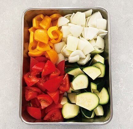 野菜はすべて大きさをそろえて切ると均一に火が通る。