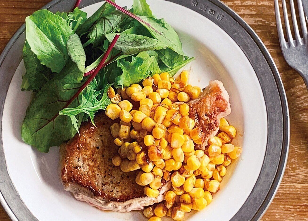 『サンキュ!』2020年8月号の「夏野菜たっぷりの毎日おかず」よりバターコーンポークステーキをご紹介します。
