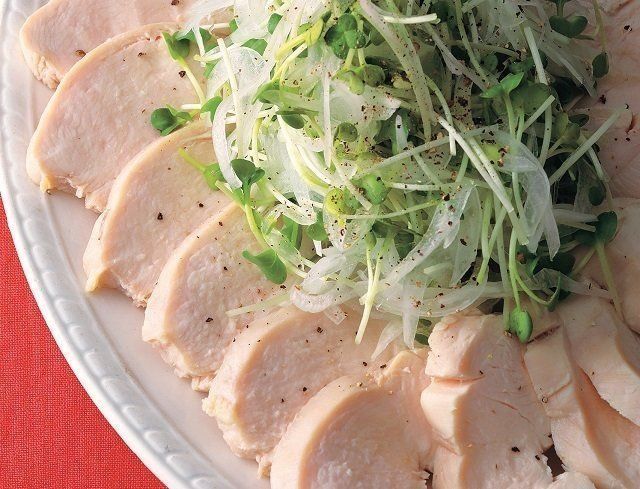 鶏肉を薄切りにして器に盛り、新玉ねぎと貝割れ菜を混ぜて添え、黒こしょうをふる。
