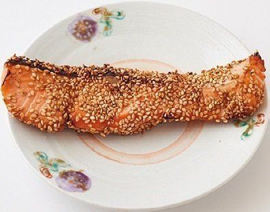 ポリ袋に、鮭、上の調味料を入れてやさしくもむ。汁けを拭いた鮭に白いりごま大さじ1をまぶし、オーブントースターで9分ほど焼く。