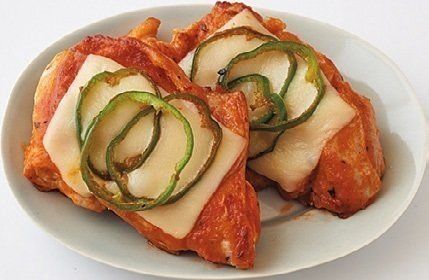 横半分に切った鶏もも肉を両面各4分焼き、上の調味料を入れてからめる。半分に切ったスライスチーズ1枚分、輪切りのピーマン½個分をのせてふたをし、火を止めて1分蒸す。