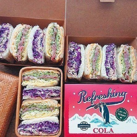 具だくさんのぎゅうぎゅうサンドもお弁当の定番。パンにはさんだあと、ラップで包んでおいておくと、パンと具がなじみ、カットしやすくなります。紫キャベツで彩りアップ。(亜希子さん)