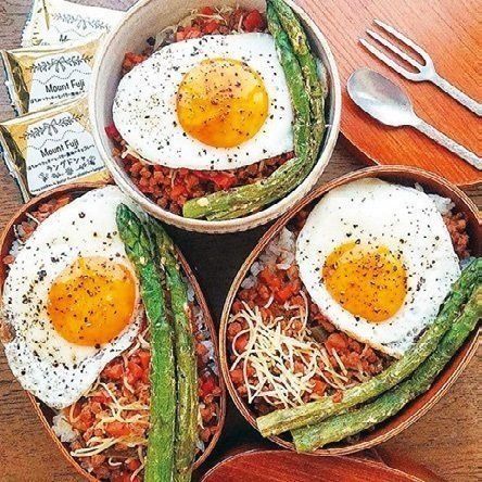 辛い物が苦手なので、ガパオライスに見えますが、実はみそ味。目玉焼きとアスパラガスをのせてエスニック風に仕上げました。スプーン1つで食べられるのがポイントです。(亜希子さん)