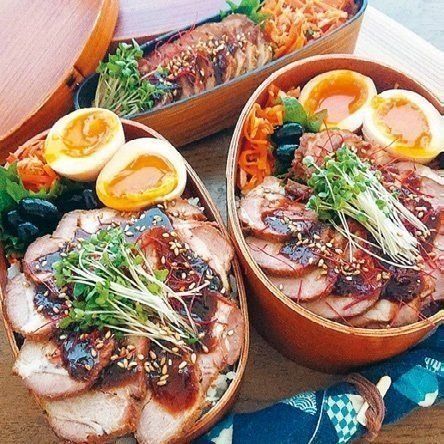 作り置きしたチャーシュウをスライスしたのっけ弁。見た目が「どか弁」にならないように、だしに漬けた半熟卵、にんじんおかか、スプラウトをのせて、彩りをアップしました。(亜希子さん)