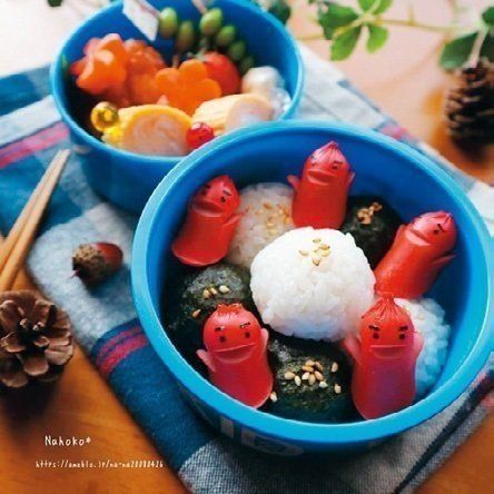 ソーセージで作った〝ソーセー人〝をたくさん散らしてつまみやすいお弁当に。