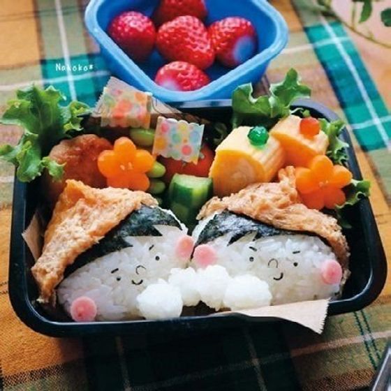 すしの素をパパッと混ぜた酢めしにぎりに、いなり揚げをかぶせて、帽子の男の子デコ。市販品を活用すれば、いなりずし作りも簡単です。れんこんつくねを添えて、和風に。