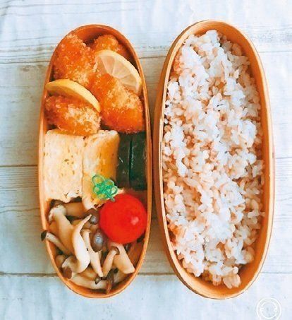 1段目には、刺し身用のおいしい帆立てをフライにしたおかずを。2段目のご飯は、もち麦を4割入れたものを詰めます。