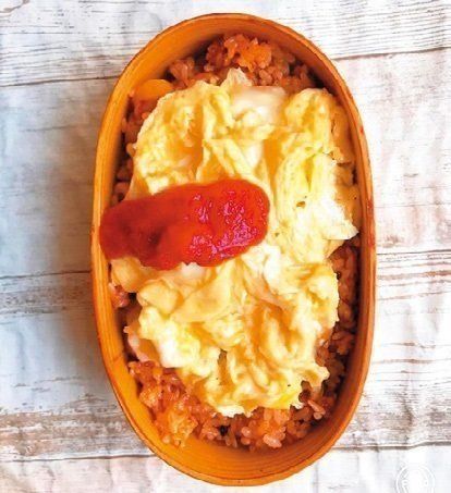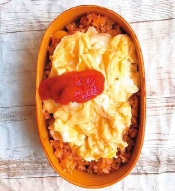 卵焼きを巻く時間もないときは、スクランブルドエッグにして、チキンライスにのせて5分で終了。超時短弁当だけど、作れただけよし!