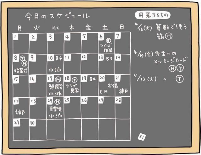 遠足などの行事、提出物の期限、その日の特別な持ち物など、重要な情報はきょうだい全員分カレンダーに記入。全員のプリントを読み返すのは大変なので、忘れると困ることは、これを見るだけでわかるようにします。