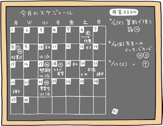 工作の材料やお道具箱などその日の特別な持ち物は、カレンダーの余白に「用意する物」のコーナーをつくって記入。子どもに毎朝、確認させます。「低学年の子に関係することは平仮名で書く」など、年齢に合わせた工夫を!