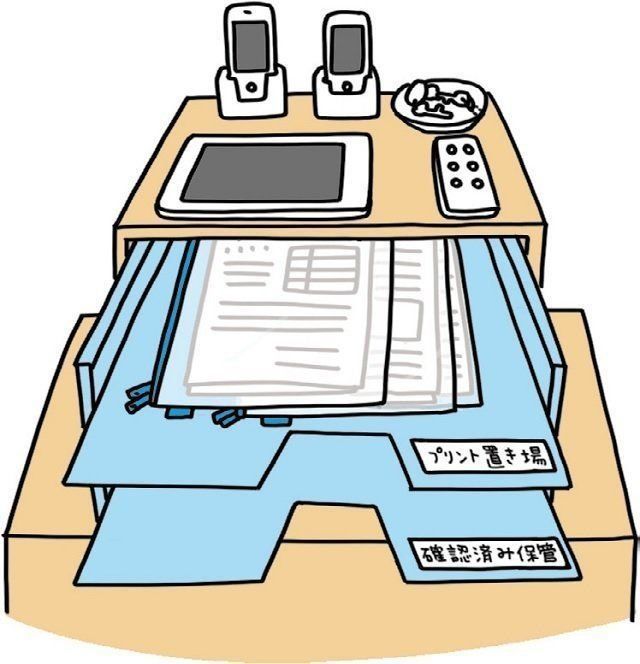 リビングなど家族の共有スペースに、プリントが置けるファイルトレーなどを設置。「プリントを出してから、夕食を食べる」などをルールにして、夕食前にママがチェック。「ちゃんと出した?」と声かけをします。