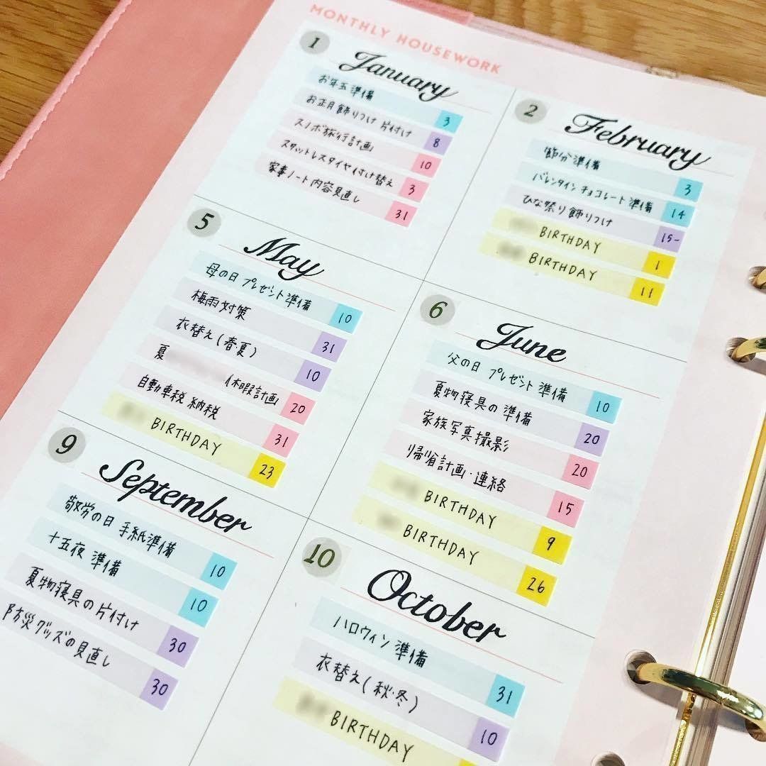 こちらは毎月のやることリストを付箋で!付箋だと予定が翌月に変わったときなどに便利ですよね。カテゴリー別に色を変えているのも分かりやすいポイントです!
