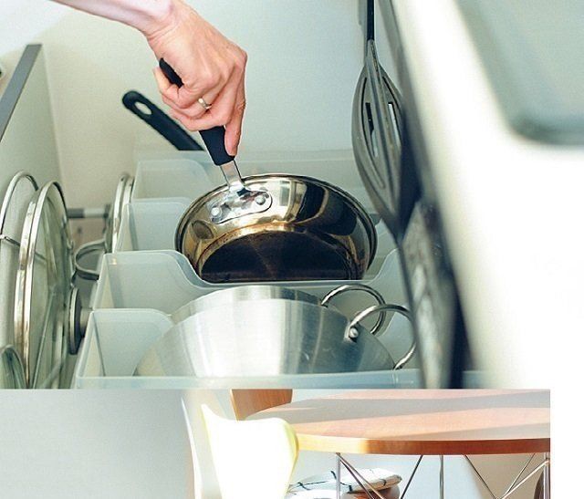 コンロ下にファイルボックスを並べ、鍋やフライパンを立てて収納。重ねると、下の物を取るときに片手で上の物を持ち上げて、もう片方の手で取ることになりますが、これならサッと取れます。