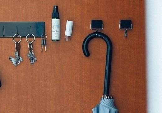 ドアにマグネットフックなどをつけて、鍵、傘、虫よけスプレーなど外出時に使う物と、宅配便用の印鑑を収納。片手で取れるので、出かけ間際がスムーズに。「鍵がない!」と慌てることもありません。