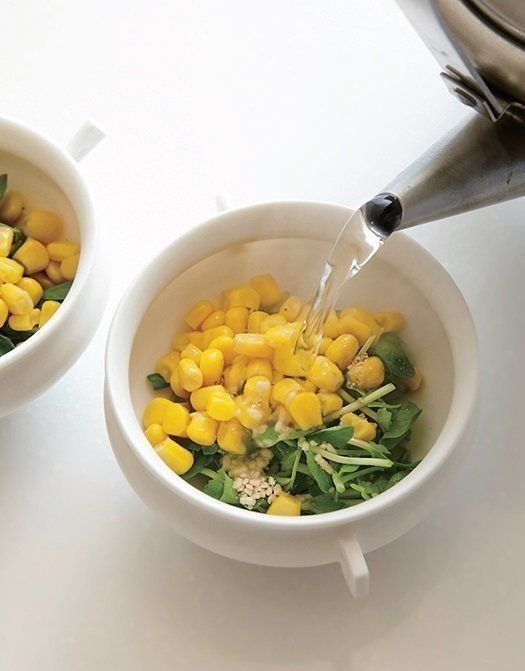 やかんから熱湯を均等に注ぐ。味をみて、塩少々で味をととのえる。