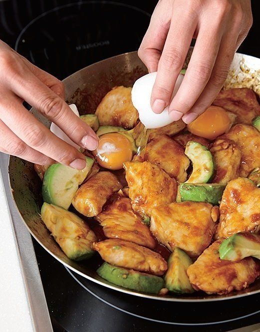 フライパンにオリーブ油を中火で熱し、鶏肉を入れ、2分ほど焼いたら返し、2分ほど焼く。Aを加え、煮立たせながらからめる。アボカドを加えてざっくりと混ぜる。焼きすぎないことがコツです。