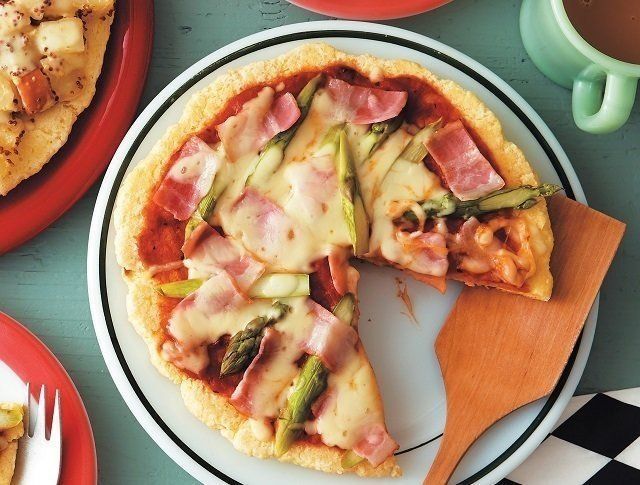 (3)2 の上に、ピザ用ソースを塗り、ベーコン、アスパラガスをのせ、ピザ用チーズを散らす。ふたをして、8~10分焼く。