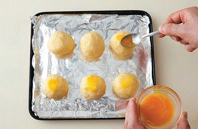 溶いた卵黄に水少々を混ぜ、2の表面にスプーンなどで塗る。オーブントースターに入れて約8分焼く。途中、焼き色がついたらアルミホイルをかぶせる。