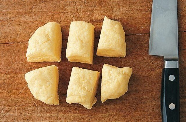 基本の生地をまな板に移し、包丁で6等分に切る。