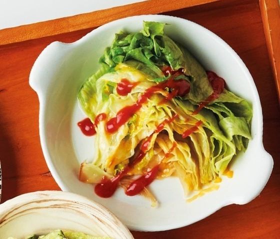 レタス1個を縦に4つ割りにして、耐熱容器にのせる。ピザ用チーズ20gを散らしてラップを掛け、電子レンジ(600W)で3分加熱する。器に盛り、ケチャップ適量をかける。