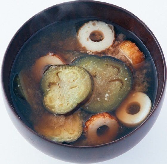だし汁を煮立て、薄い輪切りのなす2個分をくたくたに煮てみそを溶き、小口切りのちくわ2本分を加えて温める。