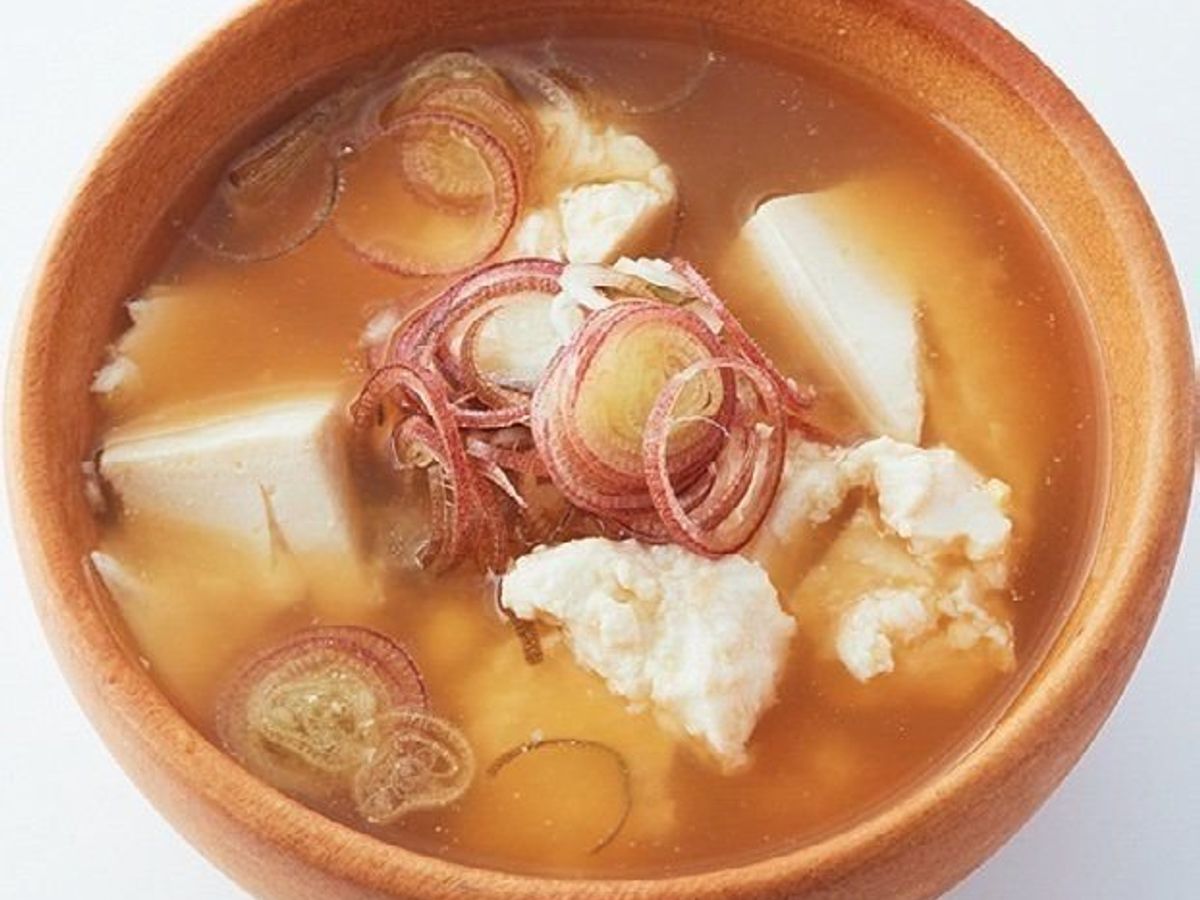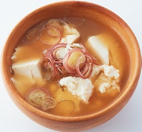 だし汁を煮立て、木綿豆腐1丁をくずしながら加え、みそを溶いて器に盛る。小口切りのみょうが2個分を加える。