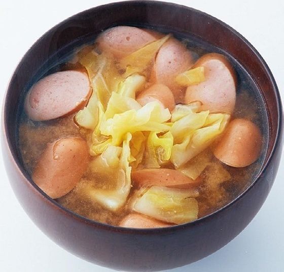 だし汁を煮立て、ざく切りのキャベツ4枚分、斜め薄切りのソーセージ8本分を加え、キャベツがくたっとしたらみそを溶く。