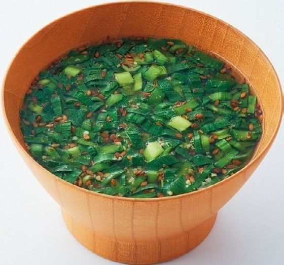 だし汁を煮立ててみそを溶き、小口切りのにら1/2束分を加え、沸騰直前に火を止める。白すりごま大さじ2を加える。