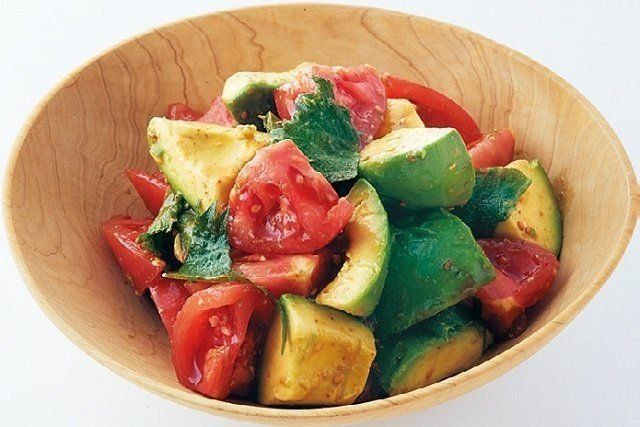ボウルに、白すりごま、しょうゆ各大さじ1、オリーブ油大さじ½を合わせ、乱切りのトマト3個分、アボカド1個分を加え、青じそ5枚をちぎり入れて混ぜる。