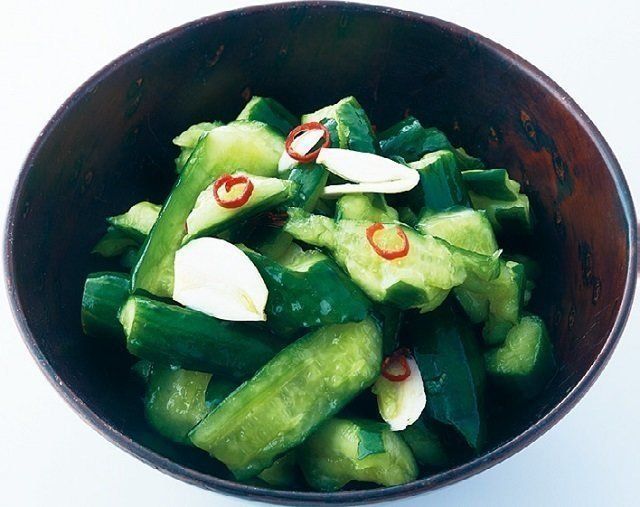 きゅうり4本をめん棒などでたたき、一口大に割る。輪切りのにんにく1かけ、小口切りの赤唐辛子2本分、塩小さじ1、ごま油大さじ1/2を加えてあえ、10分おく。