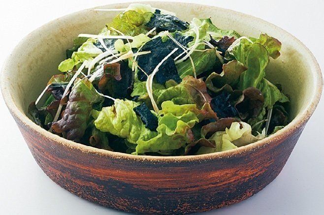 ちぎったサニーレタス1/2個分を、ポン酢しょうゆ大さじ2、ごま油大さじ1/2であえる。ちぎった焼きのり(全形)1枚分、あればしらがねぎを加えて混ぜる。