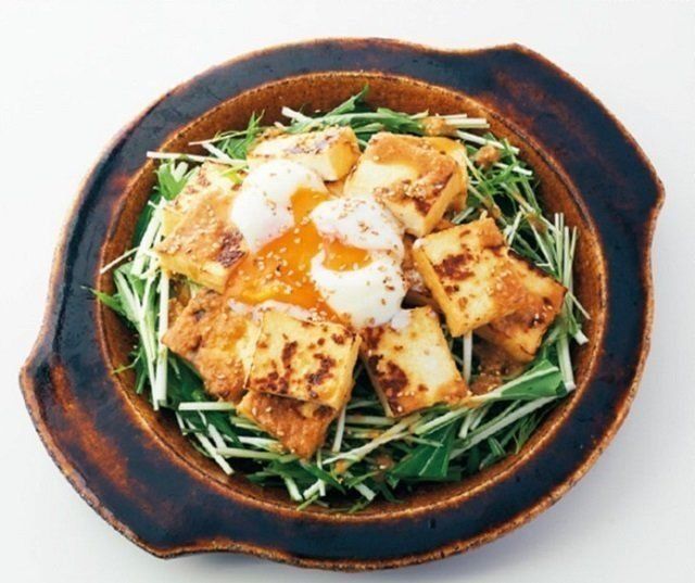 器に、長さ5㎝に切った水菜2株分を敷き、一口大に切ってフライパンで焼き色をつけた厚揚げ1枚分をのせる。酢大さじ2、みそ大さじ1、オリーブ油大さじ1/2、白すりごま小さじ1を混ぜてかけ、温泉卵2個をのせる。