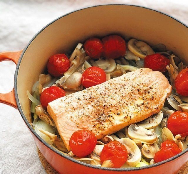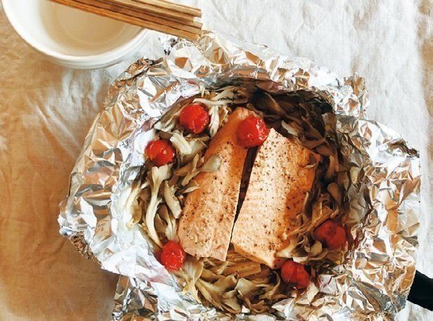 骨を取るのが面倒な魚は、刺し身をさくでドンと買います。野菜と煮れば、ボリュームもup。鍋にキャベツ、きのこ、トマト、鮭を入れてオリーブ油をかけ、コンソメと水少々、酒(具がかぶるくらい入れる)で煮るとアクアパッツァ風に。