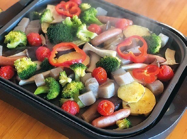 献立が思いつかない日は、冷蔵庫にある食材を何でもホットプレートで焼きます。食材は、先に塩、こしょう、オリーブ油をまぶしておくと味がなじみ、火の通りもスピーディーに。