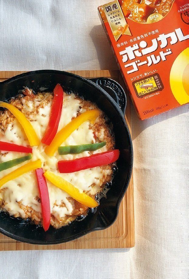 やる気が出なくても作れるカレーすらもおっくうな日は、「ボンカレー」頼み。ご飯と混ぜてフライパンで蒸し焼きにすれば、カレーパエリヤ風に。チーズをたっぷりのせると、とろとろで絶品です♪